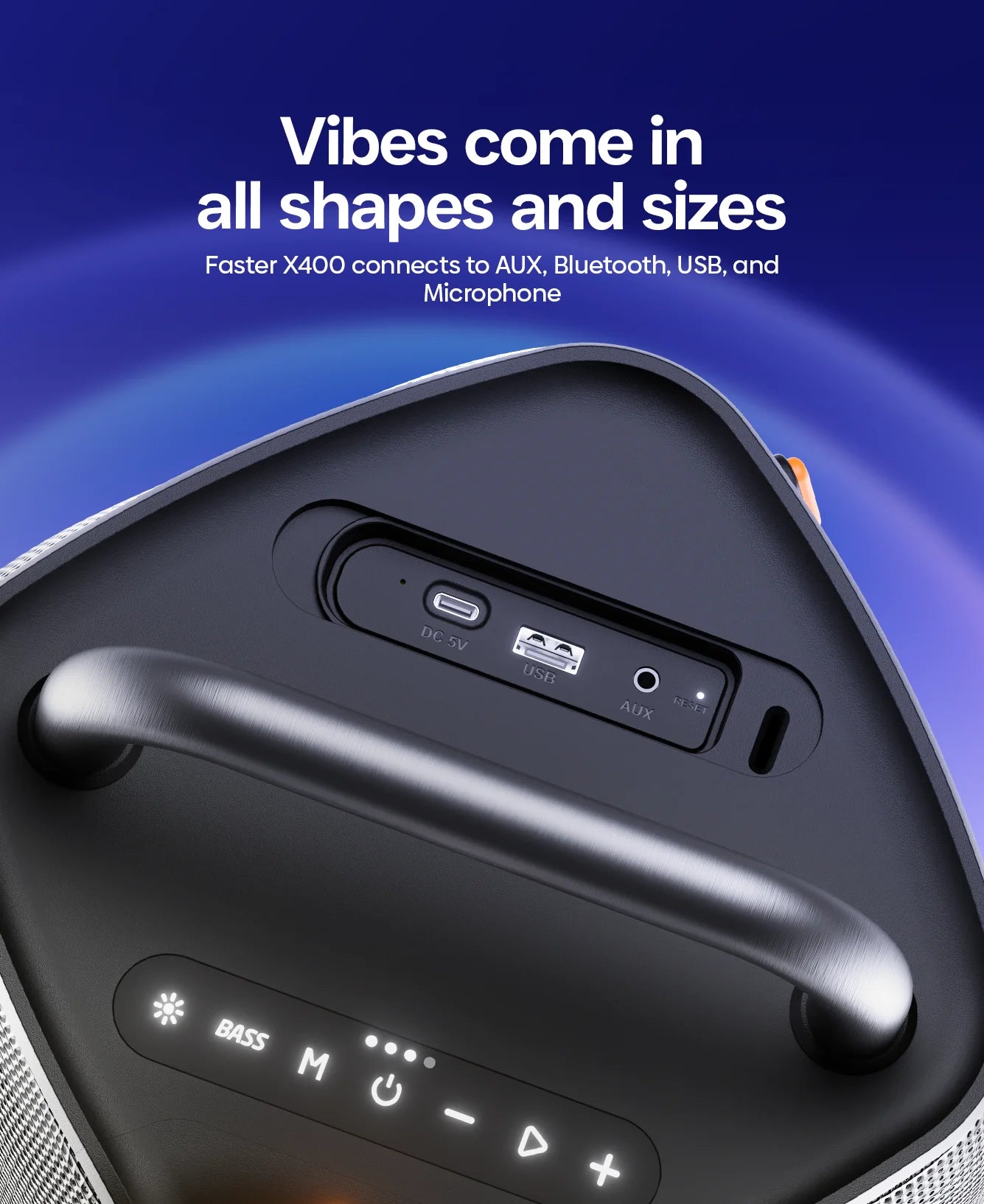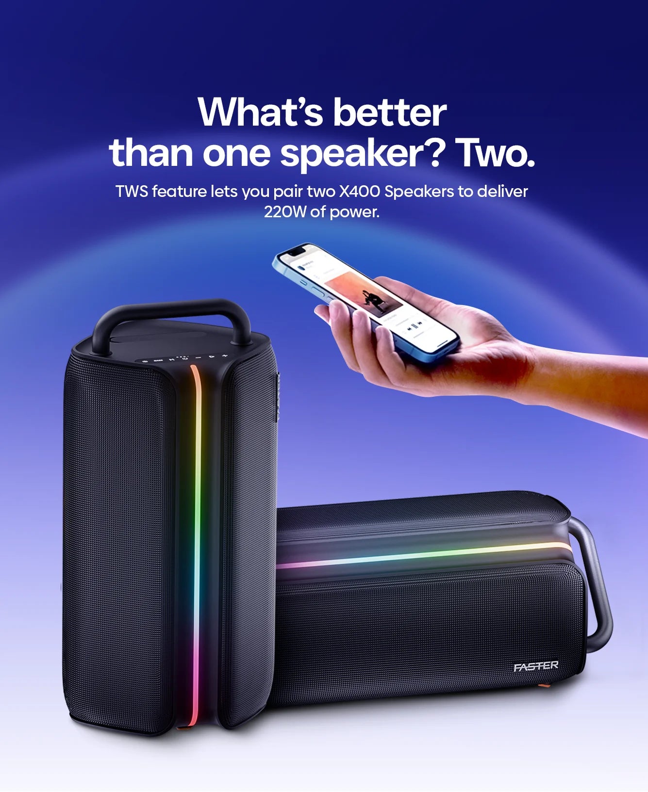 Faster BashBeats X400 Bluetooth Speaker takes the party everywhere with 110W sound and deep bass. It provides great sound, simple Bluetooth connectivity, and endless power compared to typical speakers, either indoors or outdoors.
